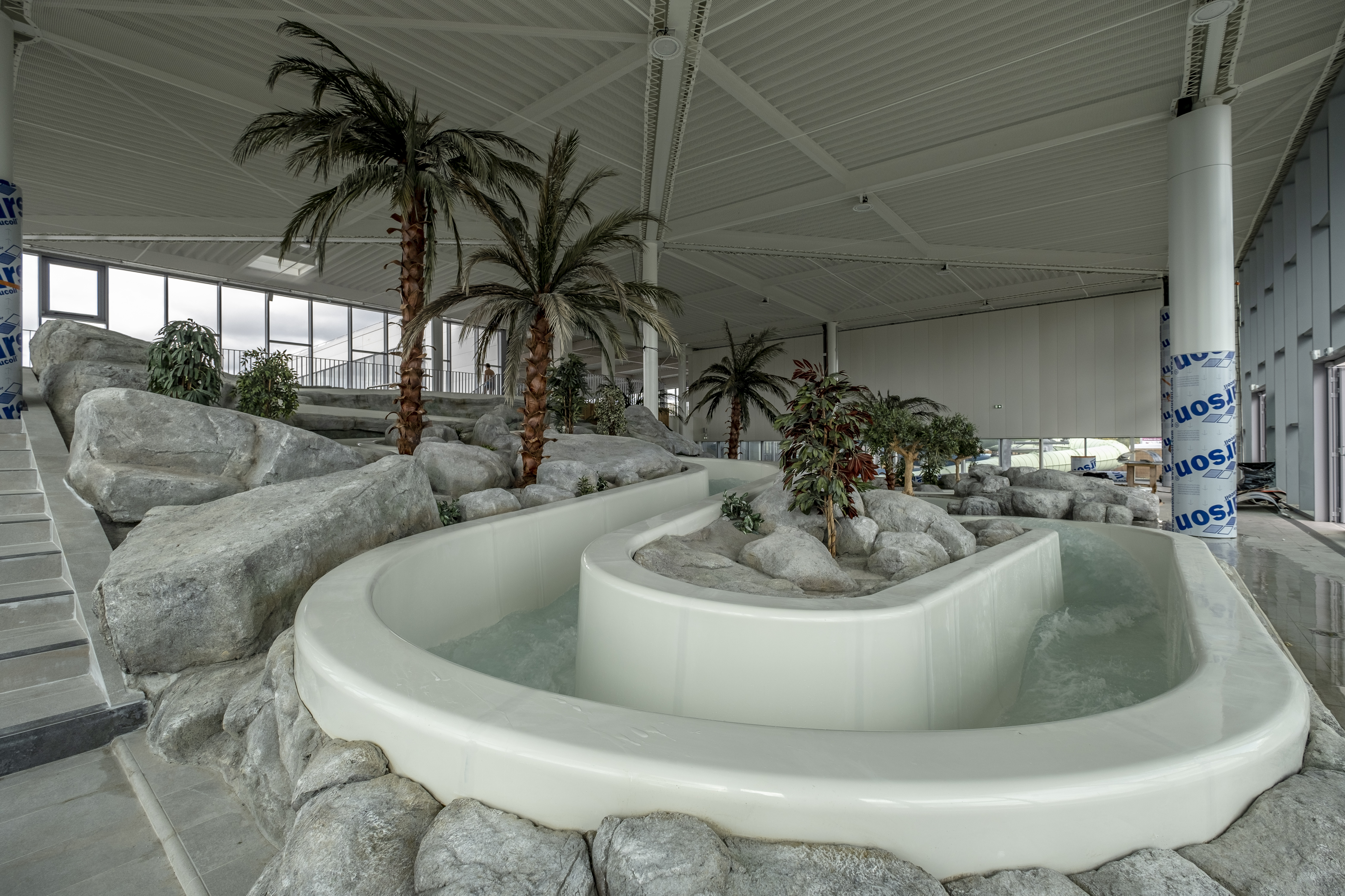 Services: approx. 300 sqm of rock design on various levels at the big water toboggan, approx. 45,000 kg of modelling concrete used, creation of the decorative palm trees up to 6 metres high made of natural materials.